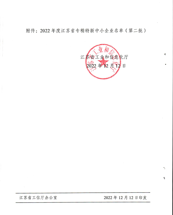 公司与2022年12月12日通过了江苏省工业和信息化厅认定的2022年度江苏省专精特新中小企业认定。