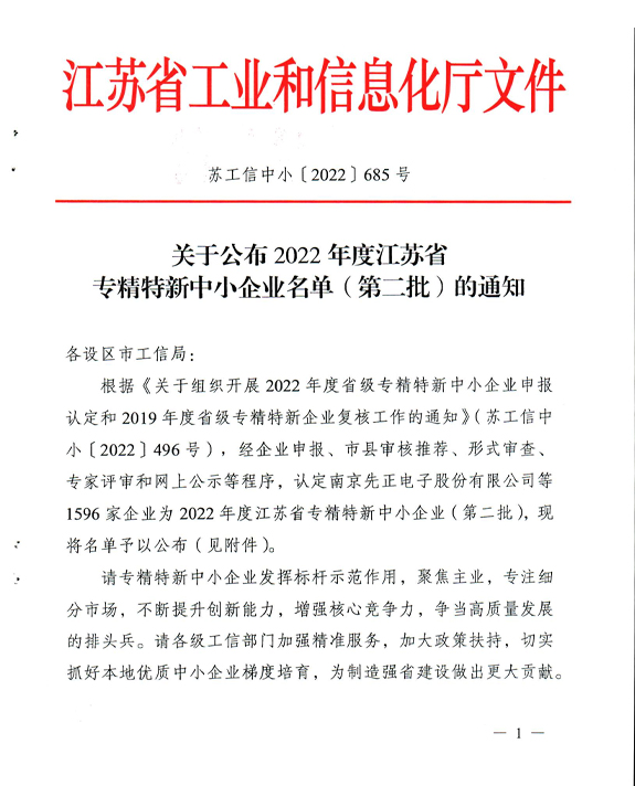 公司与2022年12月12日通过了江苏省工业和信息化厅认定的2022年度江苏省专精特新中小企业认定。